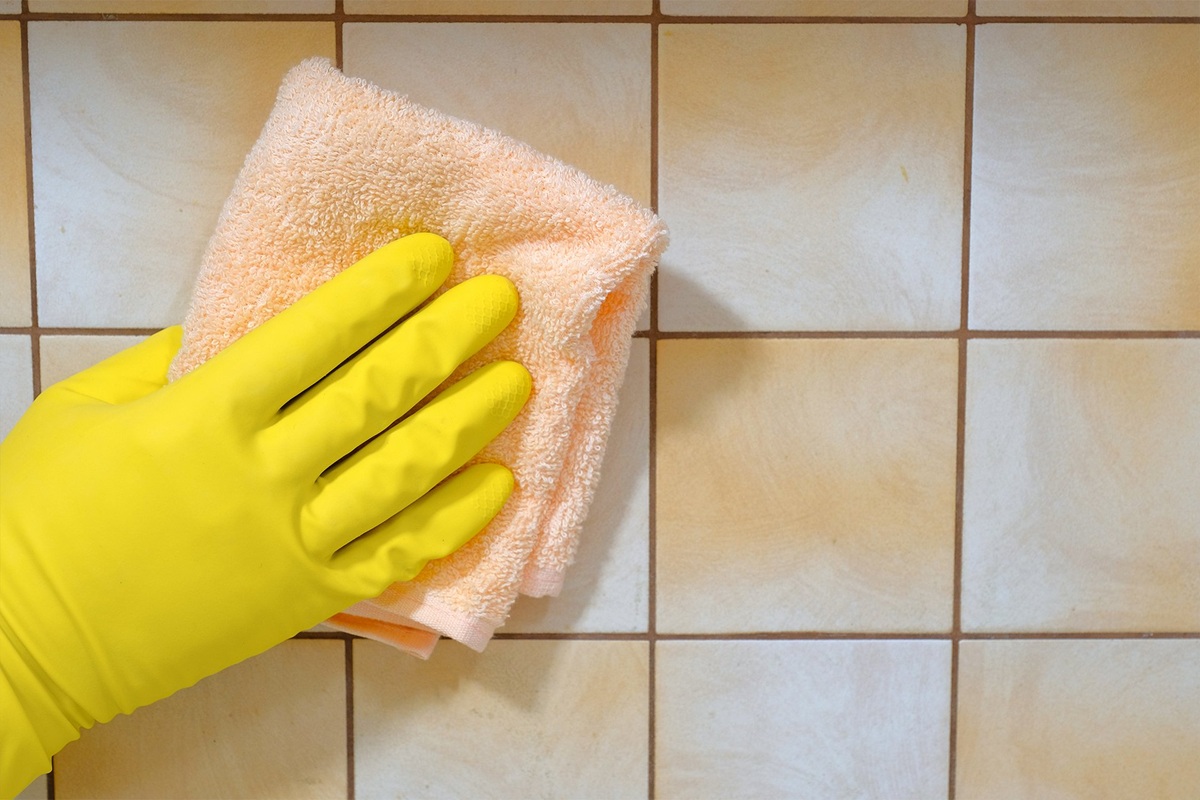 - Com a ajuda de uma escova, esfregue as manchas de gordura, passando por cada azulejo e pela junção entre eles. Remova com uma esponja húmida e seque com um pano limpo e macio.